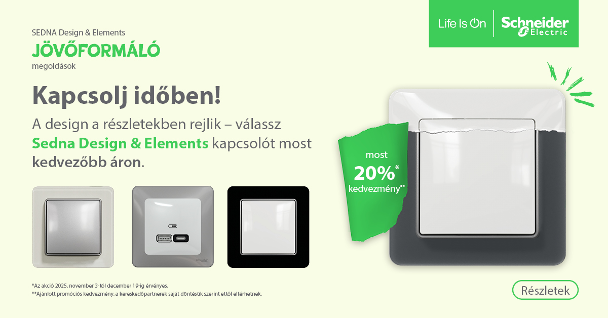 November 3. és december 19. között a Sedna Design & Elements kapcsolók és dugaljak 20% kedvezménnyel vásárolhatók meg.